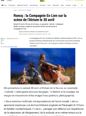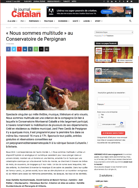 Inspiré par une écriture littéraire originale – Nous sommes multitude, Correspondances de l’autre monde – ce spectacle vise à partager une réflexion sur l’expérience de la séparation, de l’éloignement, de la solitude, et en même temps sur la possibilité de reconstruire la trame du lien social déchiré.