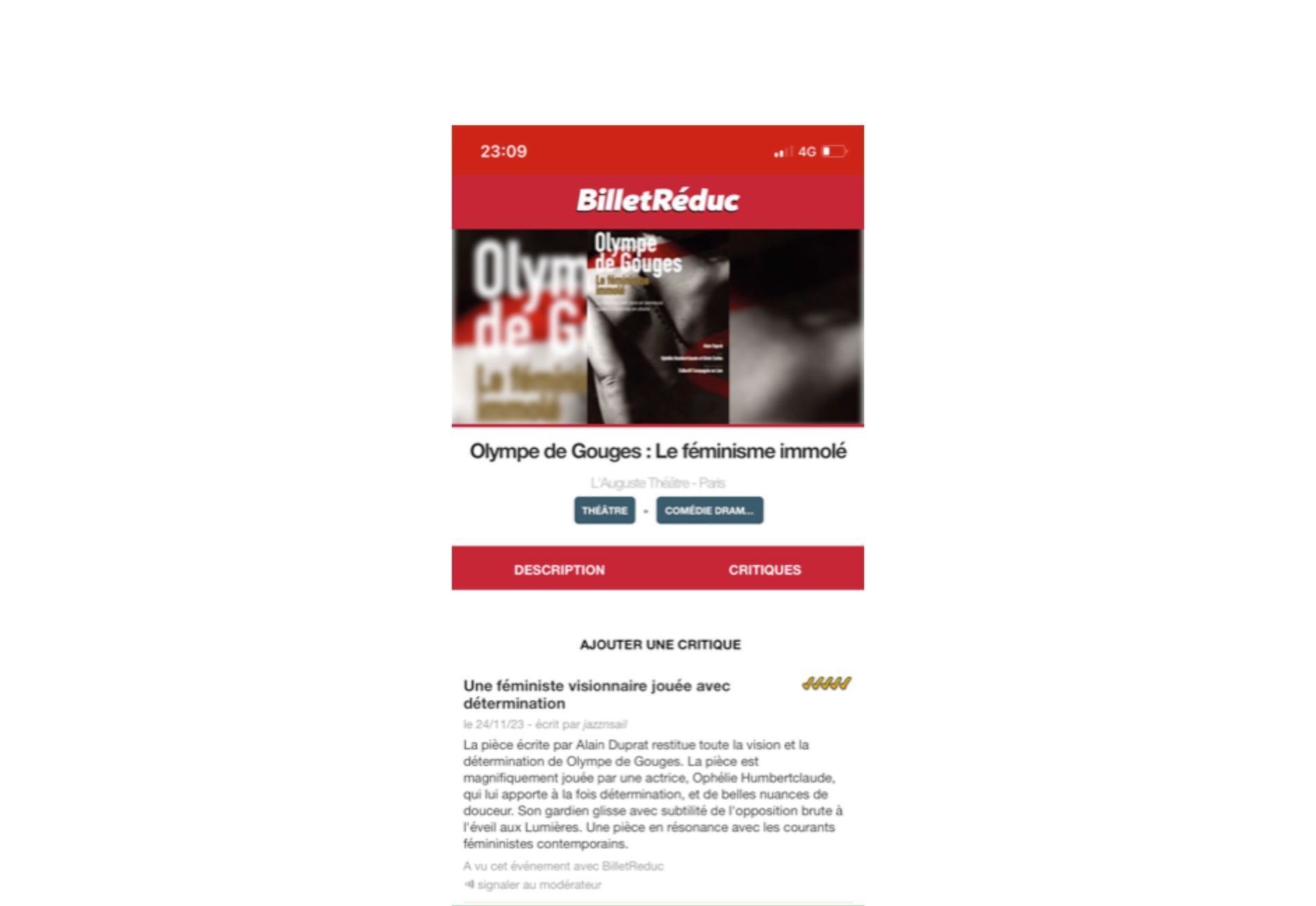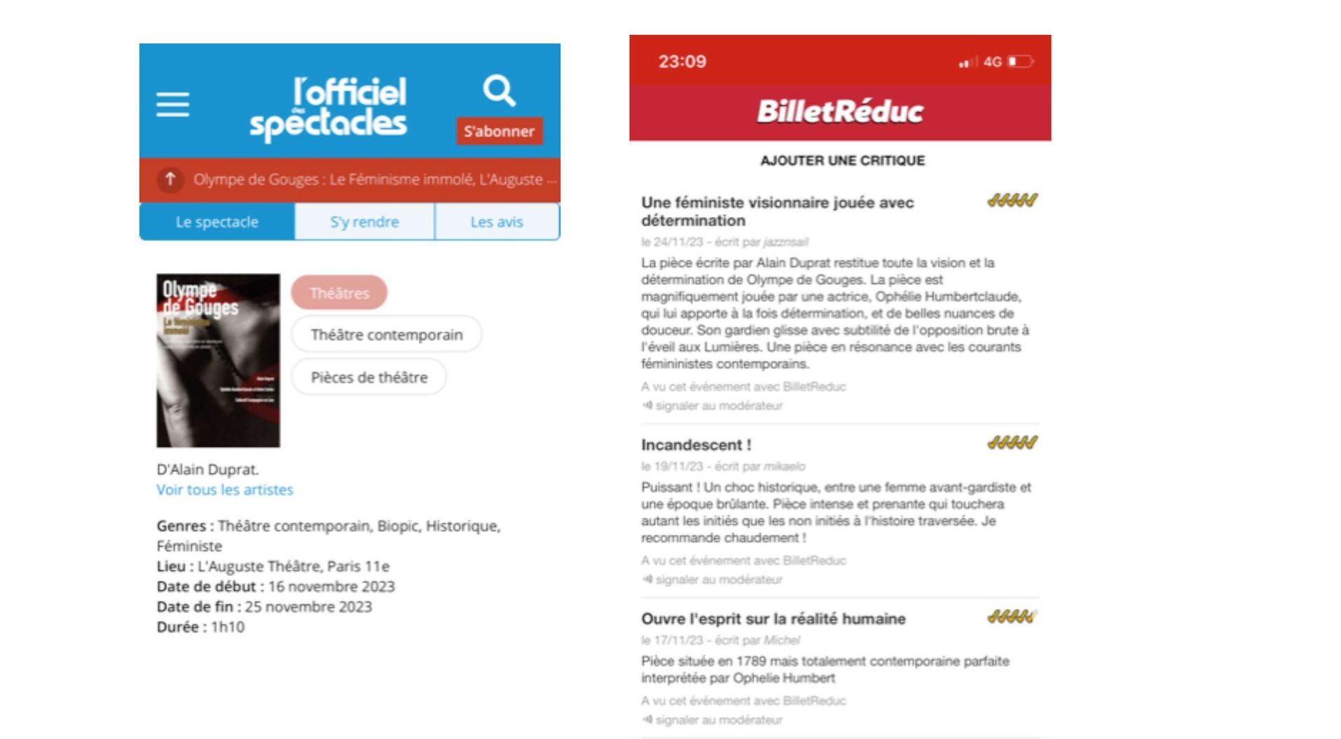 Olympe de Gouges – Le féminisme immolé, une pièce contemporaine qui met en exergue le courage d'une militante, mais aussi son franc parler et son humanité. Olympe de Gouges, sans doute l'une des plus belles figures de son temps.